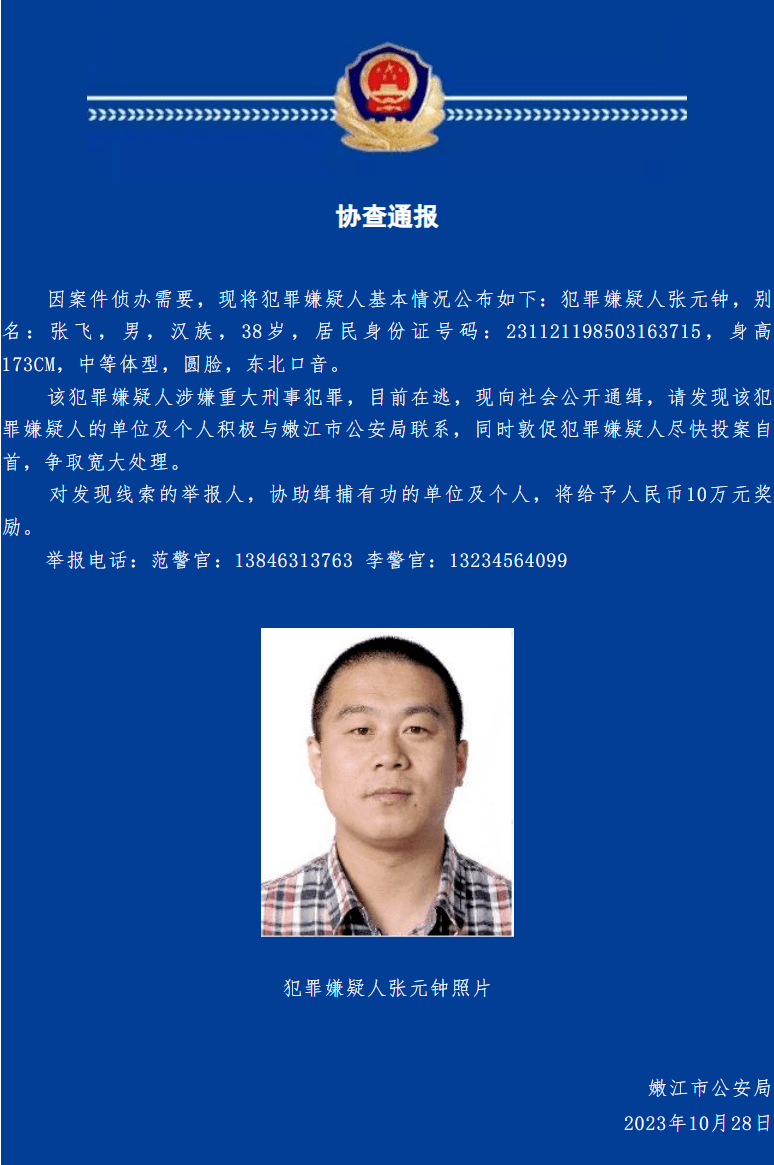 因案件侦办需要,现将犯罪嫌疑人基本情况公布如下:犯罪嫌疑人张元钟,别名:张飞,男,汉族,38岁,居民身份证号码:231121198503163715,身高173cm,中等体型,圆脸,东北口音。