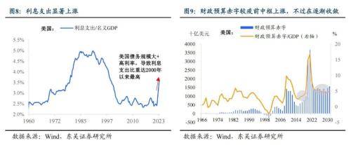 不过“宽财政”所带来的效果或不会太久。起码这种力度会逐渐放缓:虽然美国“常态化”补充财政预算,不过此前主要是在疫情或地缘政治的影响下,导致政府在医疗及国防上补充了额外的支出。前期由于财政扩张并不保守,美国也不得不面临着越来越严峻的赤字压力。这无疑也成为了两党不愿继续大幅追加支出的理由(图8-9)。