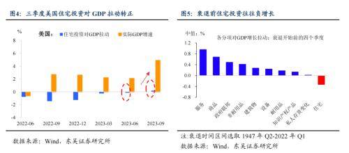 从内生的角度来看,“紧货币”并没有对利率最敏感的地产产生影响。2023年三季度美国住宅投资的转正便可以作为一大力证。三季度房地产的正增长意味着地产并没有受到525bp加息的冲击(图4)。而地产投资作为预测危机的有效指标,往往是美国经济衰退的最佳预警信号(图5)。因为历次衰退前,地产投资往往率先负增长。由此从当前来看,美国经济增长韧性延续到四季度基本没有问题。