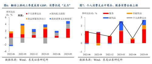 除此之外,消费无疑还是最强的。财政支持+强劲劳动力市场,支撑美国个人消费全面走强:无论是商品消费、服务消费,还是耐用品、非耐用品消费三季度均趋强(图6-7)。而这与9月大超预期的零售销售,以及汽车中二手车价格的回升,所发出的积极信号所相一致。不过,在上述强劲的因素下,学生贷款的重启支付这一意外因素,将对未来消费造成的冲击十分有限。