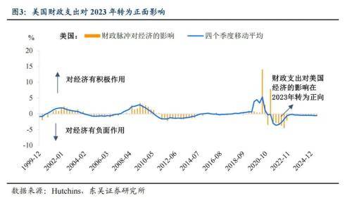 量化这一力度的话,美国Hutchins研究中心给我们提供了一些答案。从图3不难看出,政府支出在2020年对经济的支撑格外“给力”,不过随着后续财政支出力度显著降低。但这一情况在今年一、二季度又出现转机,财政支出对GDP的负面效应持续收窄,财政脉冲对经济的影响转为正面。