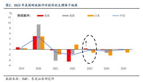 从外生的角度来看,“宽财政”抵消“紧货币”,助力美国经济的强劲上涨。这也是近期美国经济频超预期的主要原因。在2023Q1,Q2的2.2%和2.1%的经济增速中,政府支出分别贡献了0.8pct及0.6pct。虽然在今年三季度接近5%的高增下,政府支出“略有逊色”,不过依旧对三季度经济产生明显的正向刺激。有政府“兜底”的“宽财政”,也正如IMF预测,相比于其他国家,对2023年整体经济良好支撑,对冲掉了货币紧缩的冲击(图2)。