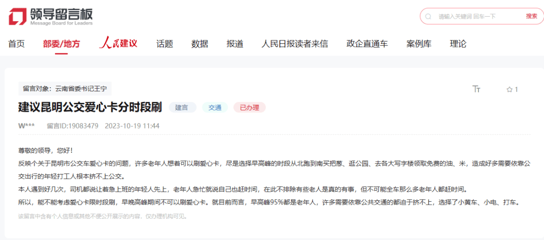 “反映个关于昆明市公交车爱心卡的问题,许多老年人想着可以刷爱心卡,尽是选择早高峰的时段从北跑到南买把葱、逛公园、去各大写字楼领取免费的油、米,造成好多需要依靠公交出行的年轻打工人根本挤不上公交。