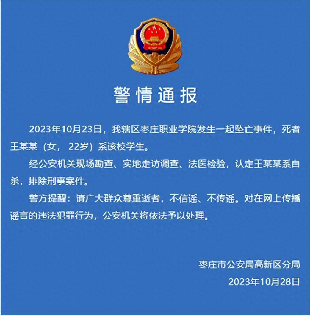 2023年10月23日,我辖区枣庄职业学院发生一起坠亡事件,死者王某某 (女,22岁) 系该校学生。