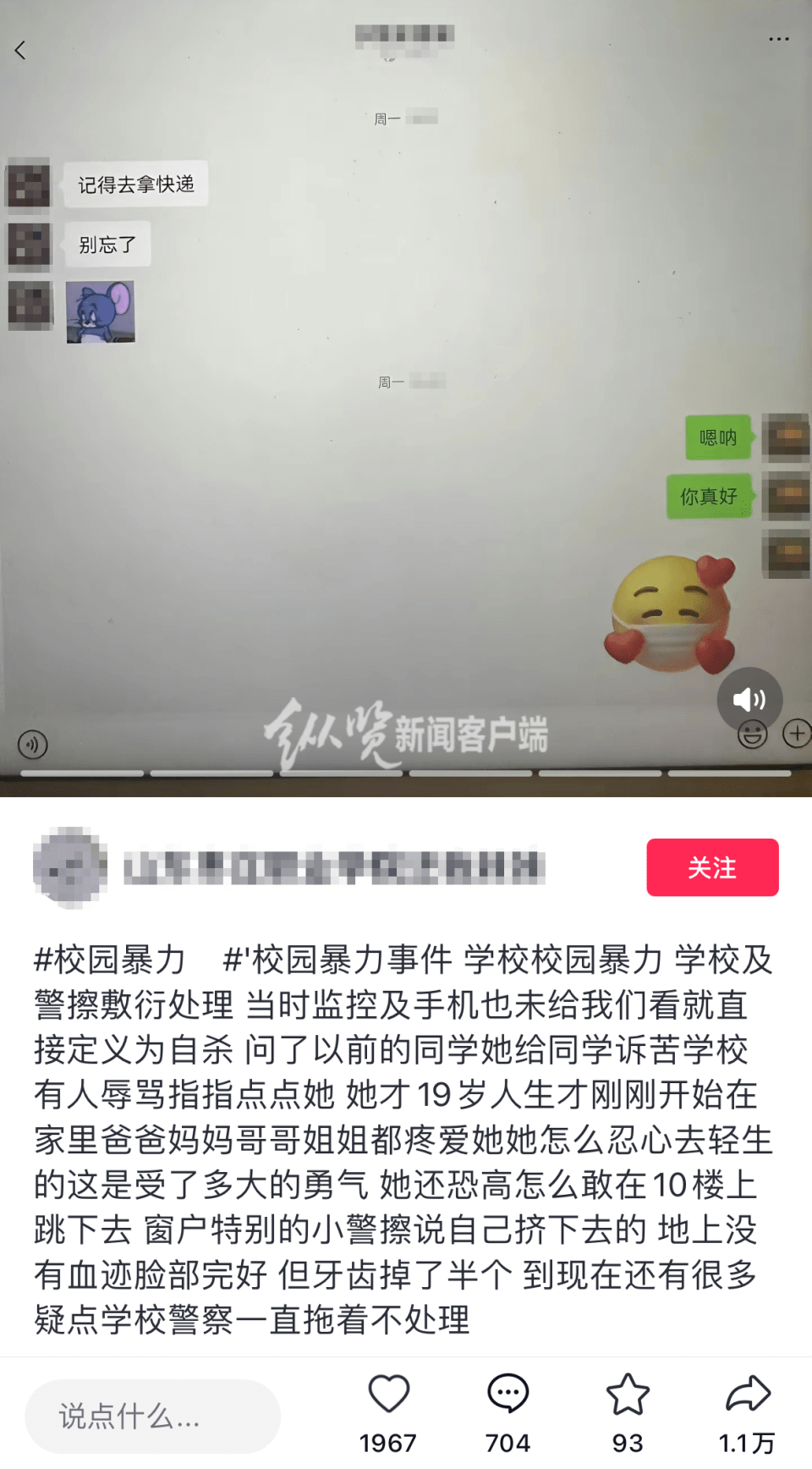25日,一位网友发布视频称,10月23日下午,父母接到枣庄技师学院老师的电话,被告知自己妹妹小兰“出事”送往医院抢救,之后父母赶到医院时,得知抢救宣告无效。校方告诉他们小兰为跳楼自杀。对于小兰选择轻生,这名网友称全家人无法接受,因为小兰刚到这个学校上了一个多月学,有疼爱的父母和哥哥姐姐,并且小兰还恐高,全家人实在想不明白是什么原因会让小兰有勇气从10楼跳下。这名网友还称校方和警方也没有让全家人查看监控和手机。