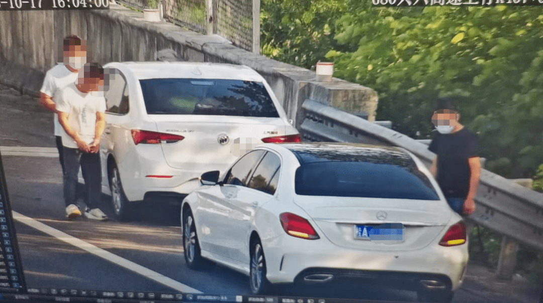 10月17日,16时许,值班民警在监控指挥中心利用监控视频对路面实时巡查时,发现在广昆高速南宁往玉林方向406km处应急车道上停靠有两辆小轿车,一辆为贵A别克小轿车,一辆为桂A奔驰小轿车。