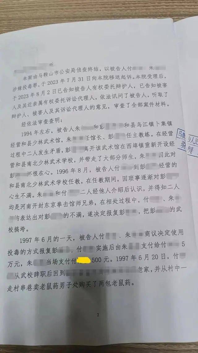 记者获取的该案起诉书中披露,该案由马鞍山市公安局侦查终结,以被告人付某某、朱某某涉嫌投毒罪,于2023年7月31日向马鞍山市人民检察院移送起诉。经依法审查查明:1994年左右,被告人朱某某和彭某某在和县乌江镇卜集镇经营和县少林武术馆,朱某某任馆长、彭某某任主教练。在经营过程中二人发生矛盾,彭某某离开该武术馆在西埠镇重新开设经营和县南北少林武术学校,并带走了大部分师生,朱某某因此对彭某某怀恨在心。