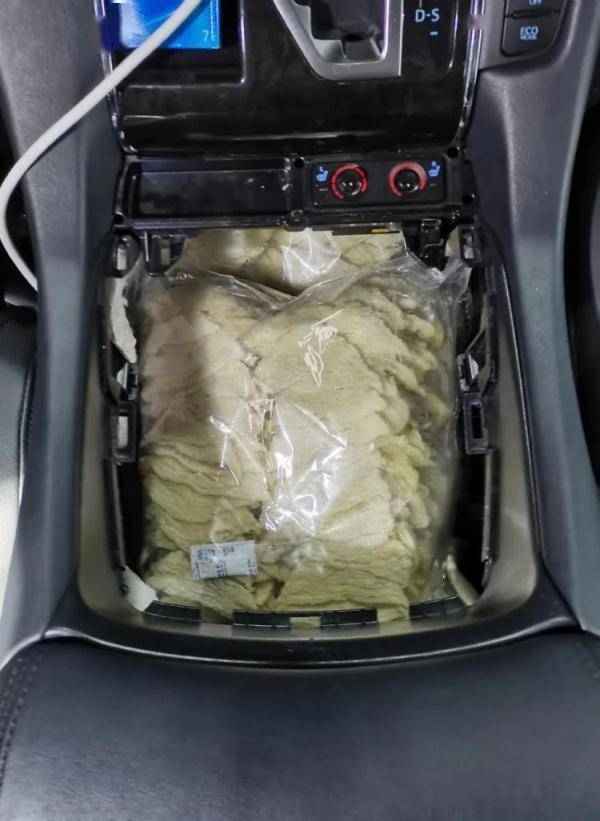 现场海关关员使用车辆检查设备扫描车体,发现车辆中控台存在异常。经进一步查验,现场海关关员发现该车中控台里藏有8包透明塑料袋包装的燕窝,重量共计9公斤。