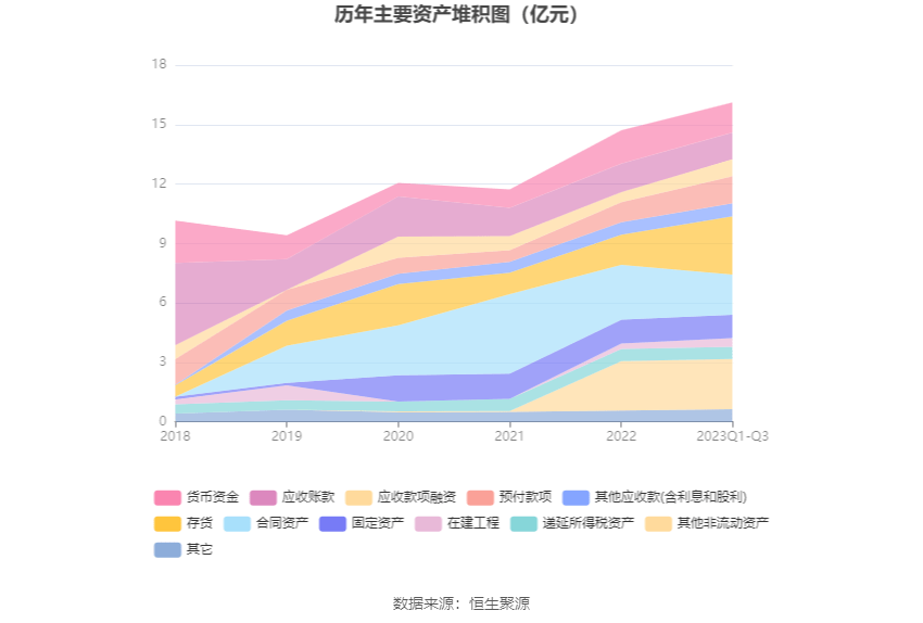 资产重大变化方面,截至2023年三季度末,公司存货较上年末增加93.21%,占公司总资产比重上升7.89个百分点;合同资产较上年末减少26.96%,占公司总资产比重下降6.27个百分点;应收款项融资较上年末增加73.00%,占公司总资产比重上升1.97个百分点;货币资金较上年末减少8.79%,占公司总资产比重下降1.92个百分点。