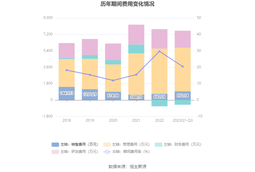2023年前三季度,公司期间费用为7090.40万元,较上年同期增加3023.44万元;但期间费用率为20.43%,较上年同期下降5.76个百分点。其中,销售费用同比增长210.0%,管理费用同比增长63.34%,研发费用同比增长44.28%,财务费用由去年同期的-461.98万元变为-511.75万元。