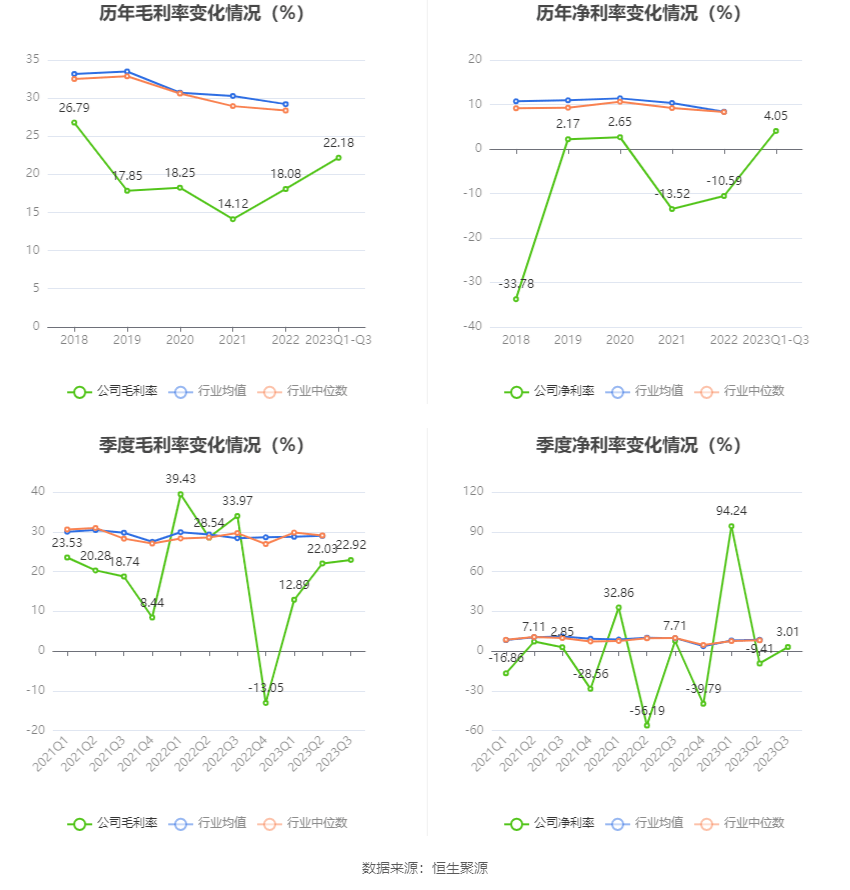 2023年前三季度,公司毛利率为22.18%,同比下降12.67个百分点;净利率为4.05%,较上年同期下降1.10个百分点。从单季度指标来看,2023年第三季度公司毛利率为22.92%,同比下降11.05个百分点,环比上升0.89个百分点;净利率为3.01%,较上年同期下降4.70个百分点,较上一季度上升12.42个百分点。