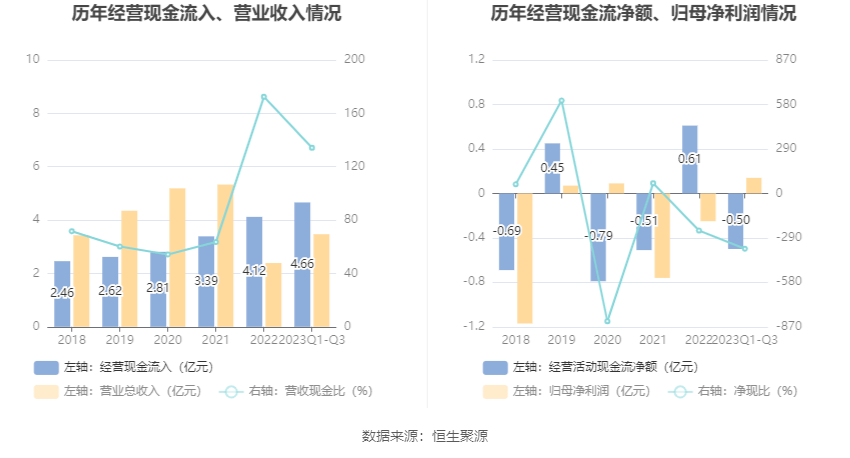 2023年前三季度,公司营业收入现金比为134.23%,净现比为-360.67%。