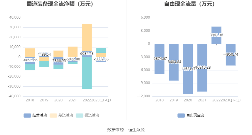 2023年前三季度,公司经营活动现金流净额为-5002.36万元,同比减少1.15亿元;筹资活动现金流净额4211.38万元,同比减少2.36亿元;投资活动现金流净额5030.20万元,上年同期为-3.1亿元。