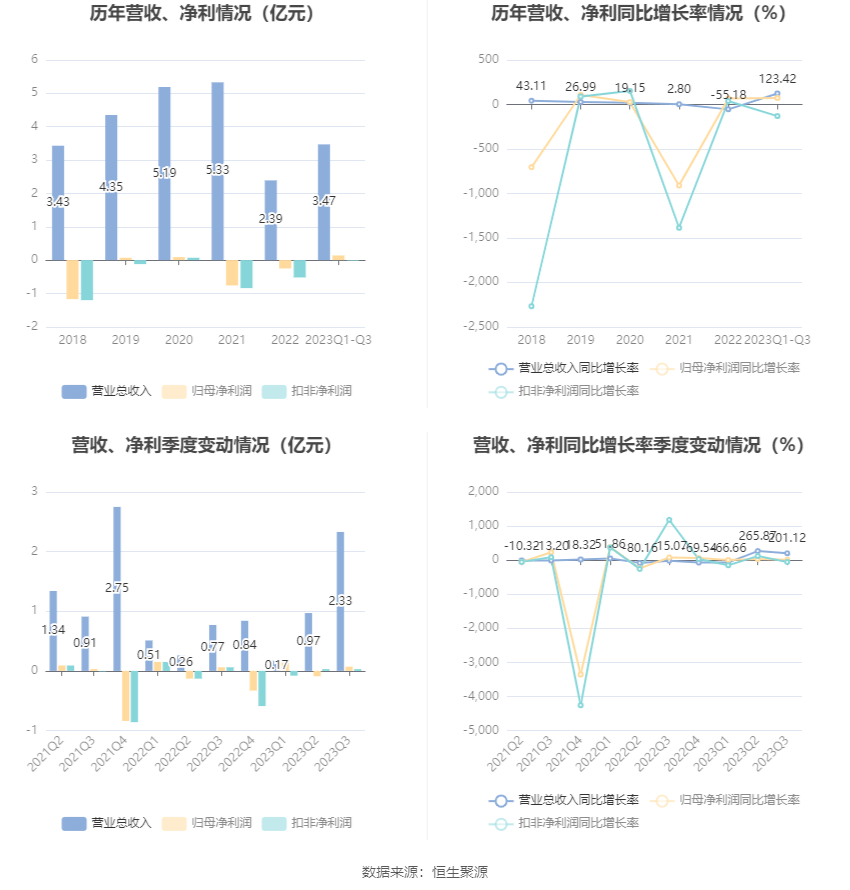 根据三季报,公司第三季度实现营业总收入2.33亿元,同比增长201.12%,环比增长140.30%;归母净利润683.74万元,同比增长14.67%,环比增长174.60%;扣非净利润266.9万元,同比下降53.07%,环比增长6.21%。