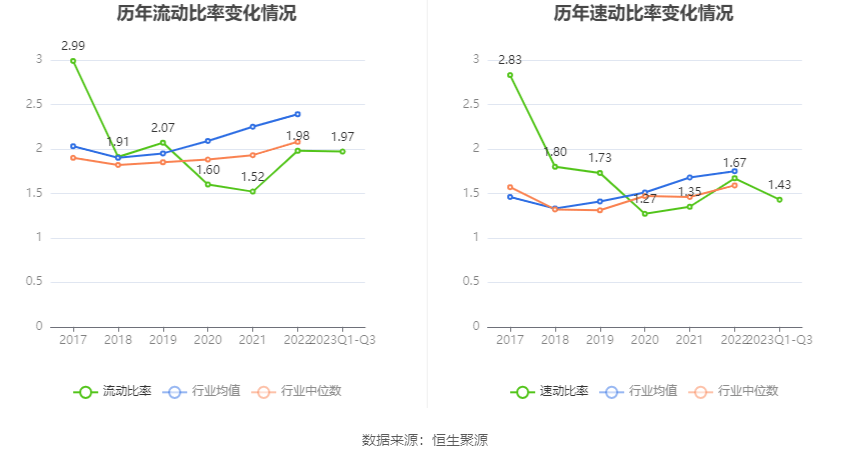 2023年前三季度,公司流动比率为1.97,速动比率为1.43。