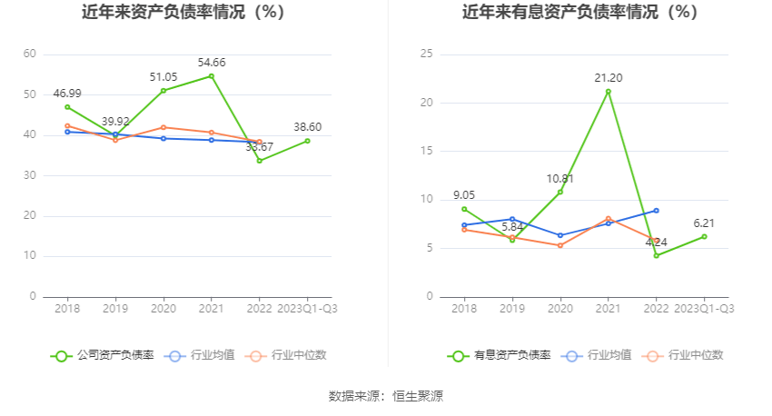 在偿债能力方面,公司2023年三季度末资产负债率为38.60%,相比上年末上升4.93个百分点;有息资产负债率为6.21%,相比上年末上升1.97个百分点。