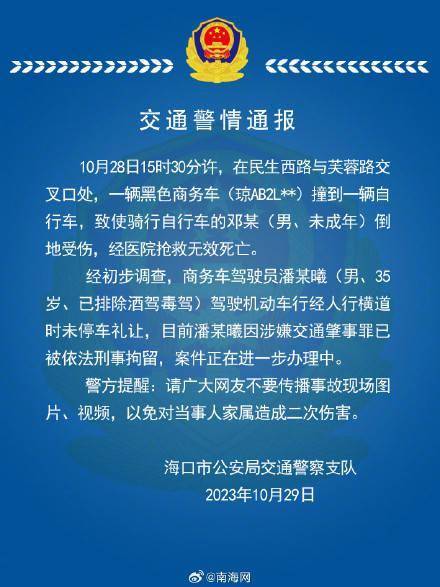2023年10月29日,海口市公安局交通警察支队发布交通警情通报,该通报称,10月28日15时30分许,在海口市民声西路与芙蓉路交叉口处,一辆黑色商务车(琼 AB2L**) 撞到一辆自行车,致使骑行自行车的邓某(男、未成年)倒地受伤,经医院抢救无效死亡。