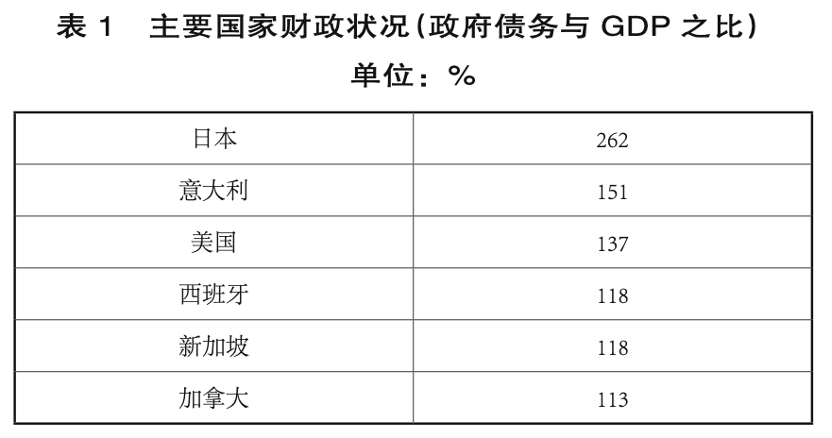 中国的财政状况。应该说,同世界上其他主要国家相比,中国政府的财政状况是比较好的。2022年中国政府债务余额合计超60.7万亿元。其中,国债25.6万亿元、地方政府一般债14.4万亿元、专项债务20.7万亿元。这样,国债+地方政府一般债对GDP比为33%;国债+地方政府一般债+专项债=50.2%。当然,如果把坊间所说的隐形债务加到一起,中国政府债务对GDP比会远高于50%。IMF认为2020年中国政府广义政府债务对GDP比为95.7%(IMF Country Report No. 22/21 );并预测这一比例在2022年将为110%。所谓广义政府债务是指包括了地方政府融资平台对债务、卖地收入。我并不认同IMF的计算方法。但是,即便如此,即便不考虑中国的高储蓄率和良好国际收支状况,中国的财政状况依然好于大多数发达国家 (表1)。主要发达国家的财政状况比中国差得多,但并没有妨碍它们执行比中国扩张性大得多的财政政策。