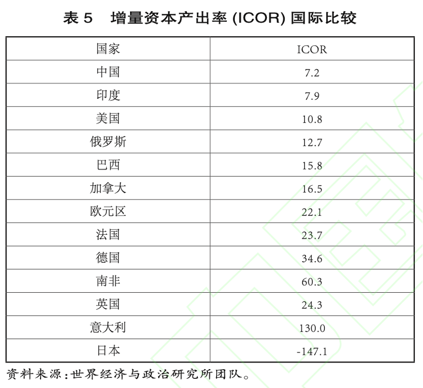 中国的资本使用效率。增量资本-产出率(ICOR)是衡量投资效率的重要指标。在人们印象中,由于中国强调GDP增长,其资本使用效率一定是低下的。根据世界经济与政治研究所的计算,中国的增量资本-产出率(ICOR)同其他国家相比依然处于较低水平(表5)。世界经济与政治研究所的计算结果同一些外国学者的计算结果是相一致的。
