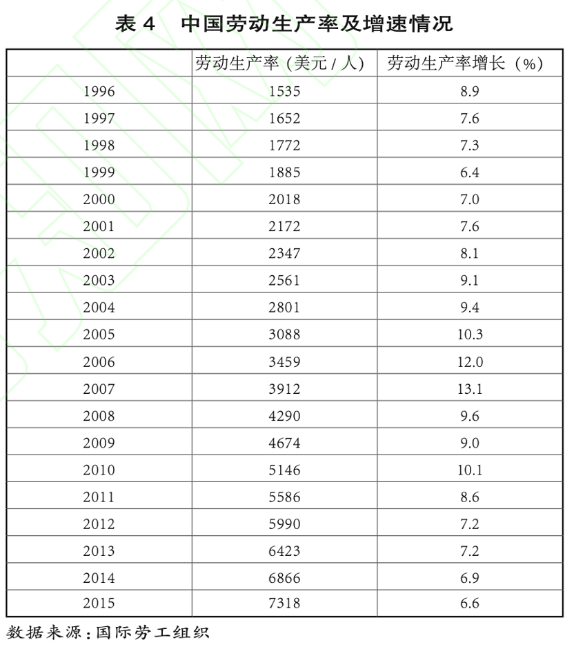 衡量生产效率的最基本指标是劳动生产率。根据增长理论,劳动生产率又主要取决于劳动力的技术装备程度(即人均资本存量)根据国家统计局公布的数据,时至2015年中国的劳动生产率增长速度依然远高于世界平均水平(表3、表4)。