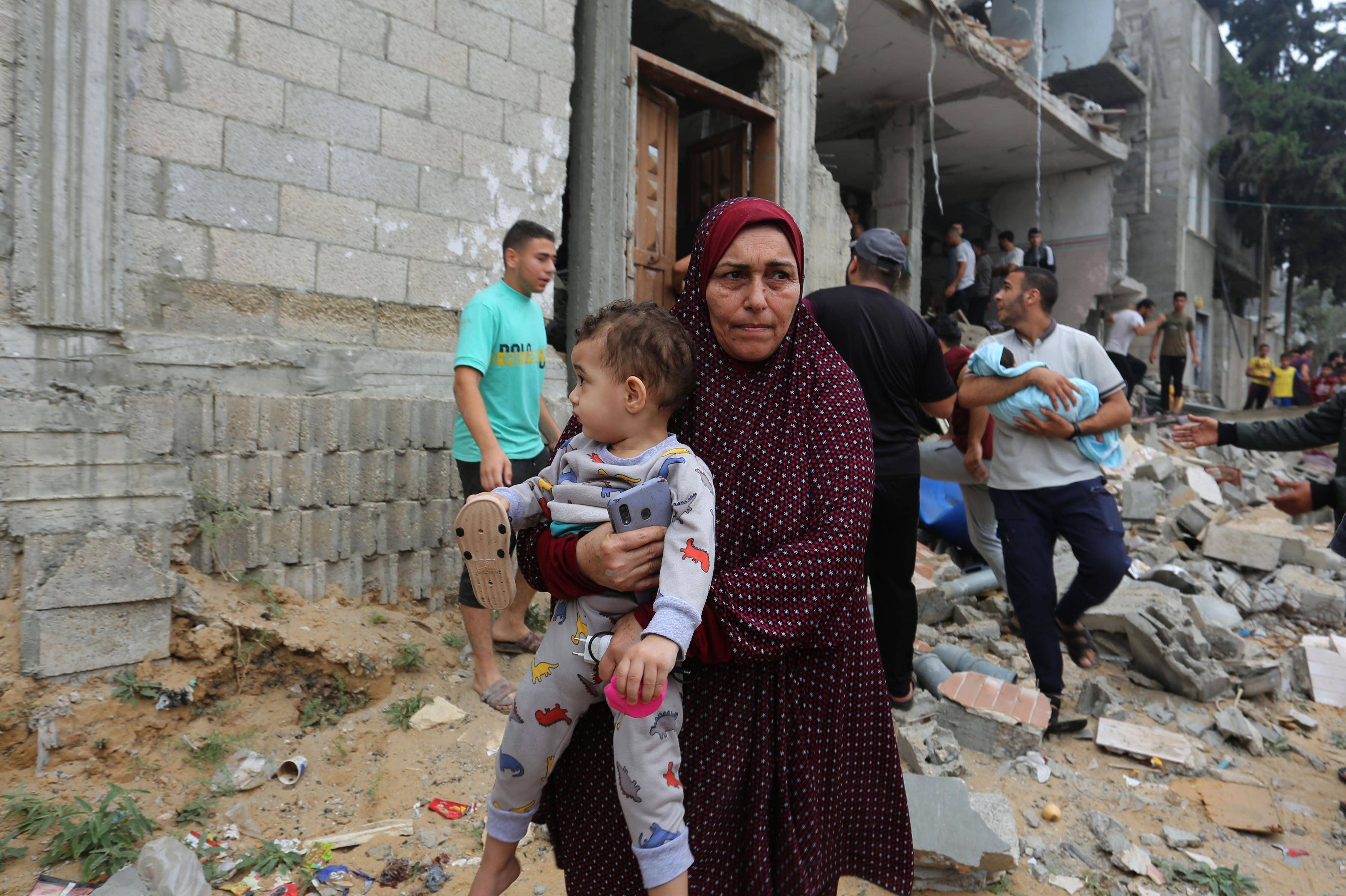 10月29日,在加沙地带南部城市拉法,人们经过被以军空袭损毁的建筑。 新华社发(哈立德·奥马尔摄)