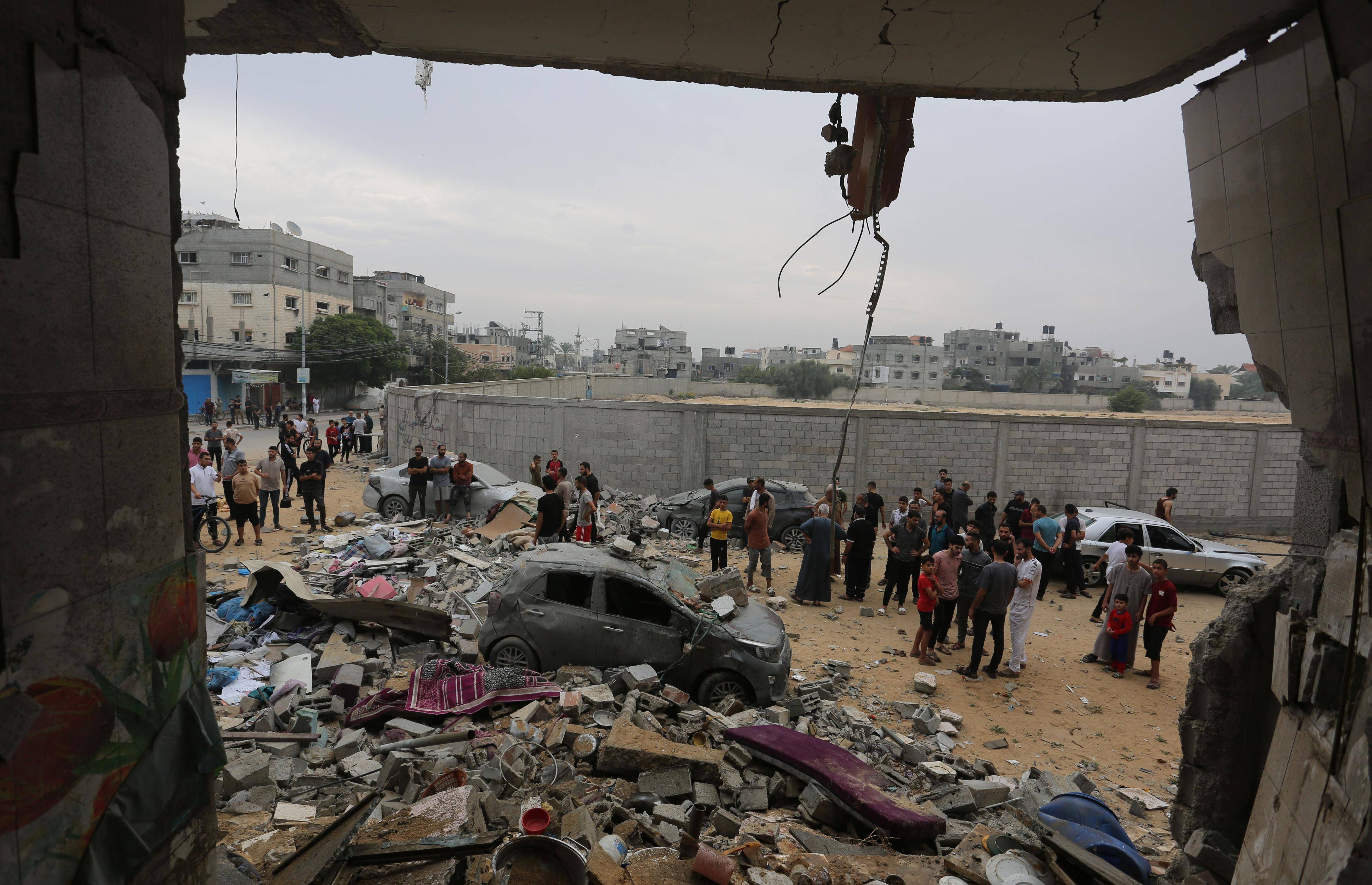 10月29日,在加沙地带南部城市拉法,人们查看被以军空袭损毁的建筑。 新华社发(哈立德·奥马尔摄)