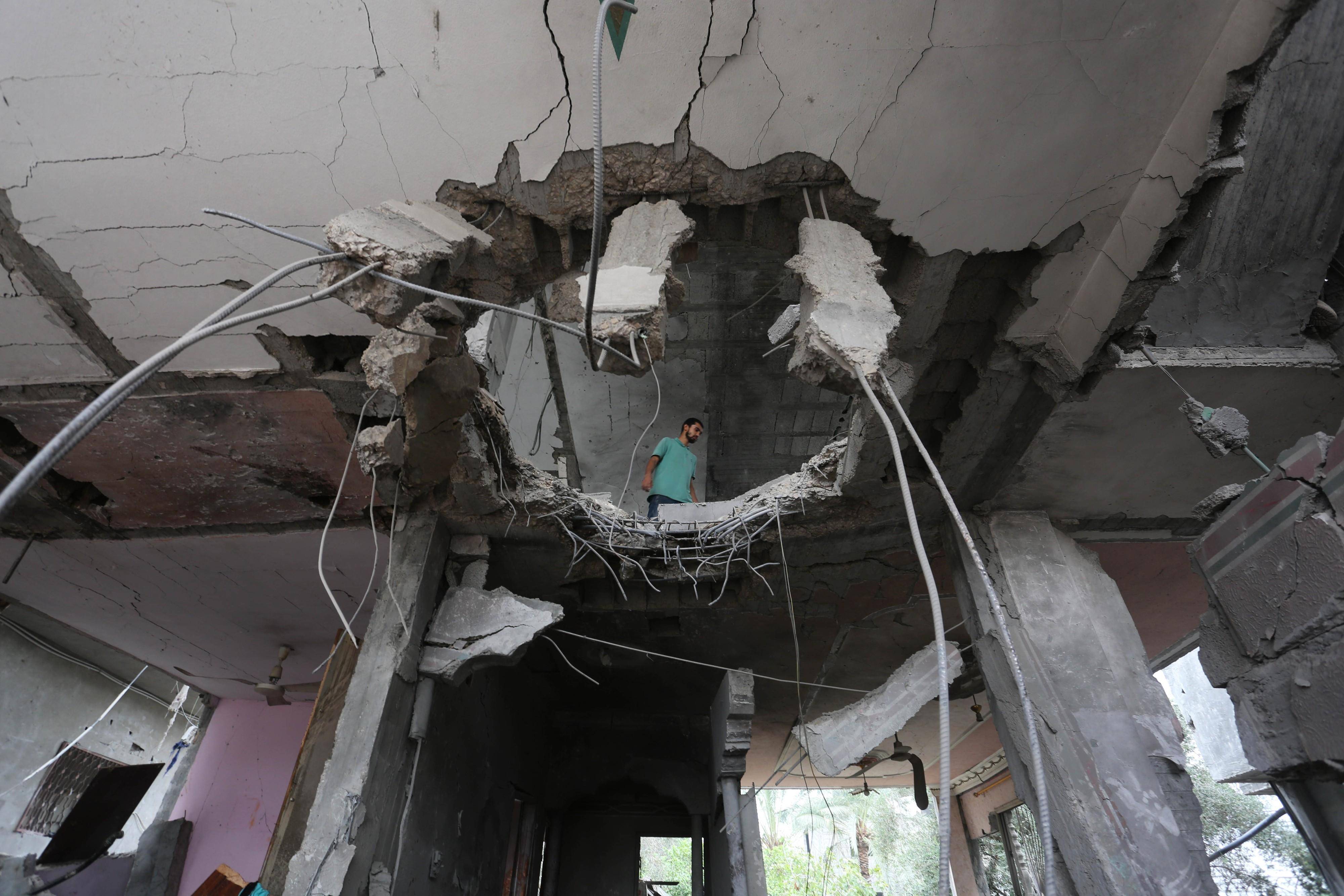 10月29日,在加沙地带南部城市拉法,一名男子查看被以军空袭损毁的建筑。 新华社发(哈立德·奥马尔摄)