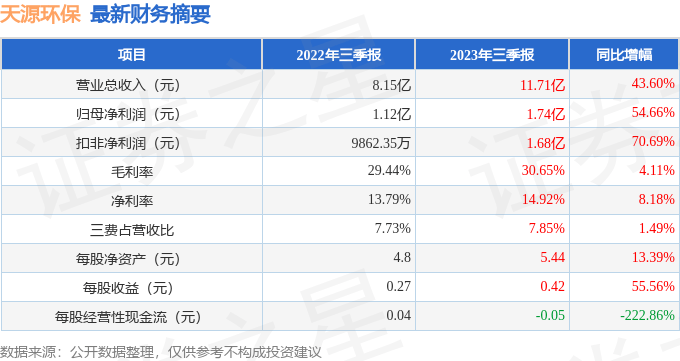 据证券之星公开数据整理,近期天源环保(301127)发布2023年三季报。根据财报显示,本报告期中天源环保营收净利润同比双双增长,盈利能力上升。截至本报告期末,公司营业总收入11.71亿元,同比上升43.6%,归母净利润1.74亿元,同比上升54.66%。按单季度数据看,第三季度营业总收入5.4亿元,同比上升120.93%,第三季度归母净利润9263.54万元,同比上升265.82%。