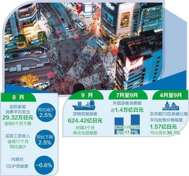 从旅游看,日本观光厅18日公布了2023年7月至9月期间访日外国游客数据,其中消费额与新冠疫情前的2019年相比增长17.7%,接近1.4万亿日元。今年1月至9月的累计消费额约为3.6万亿日元。访日游客人均旅行支出同比增长29.4%,达到21.8万日元。分析认为,旅游业消费数据提振,一方面与疫情后国外游客反弹式消费有关,另一方面也有日元贬值的因素。