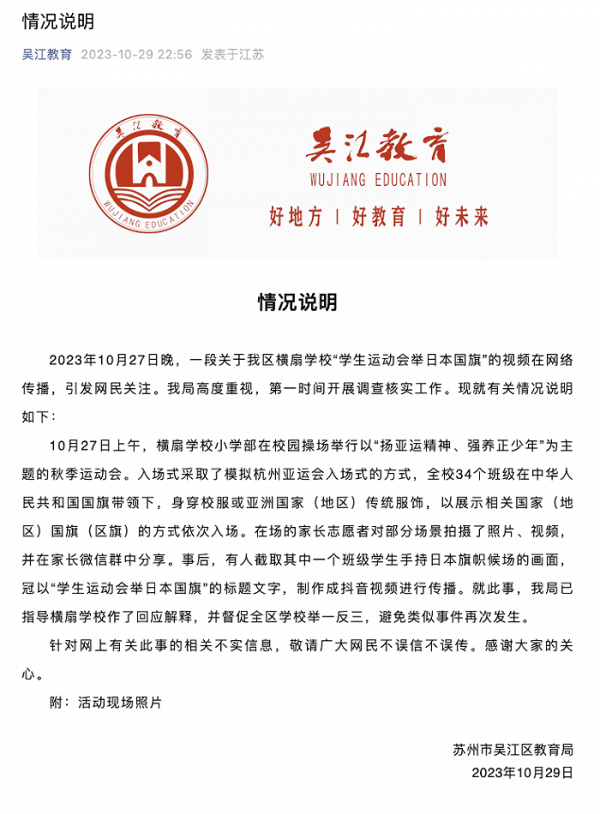据苏州市吴江区教育局微信公众号“吴江教育”10月29日消息,2023年10月27日晚,一段关于我区横扇学校“学生运动会举日本国旗”的视频在网络传播,引发网民关注。我局高度重视,第一时间开展调查核实工作。现就有关情况说明如下: