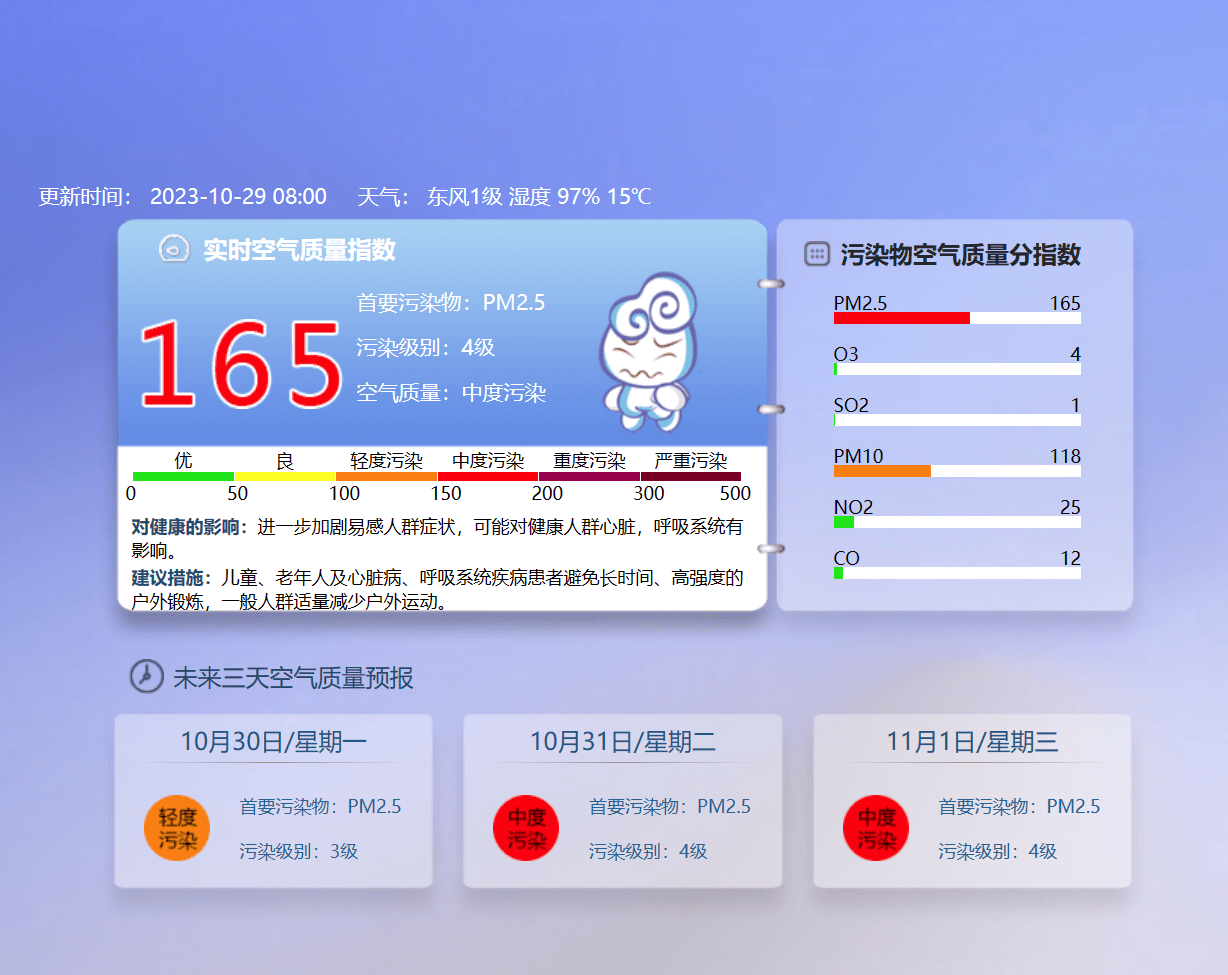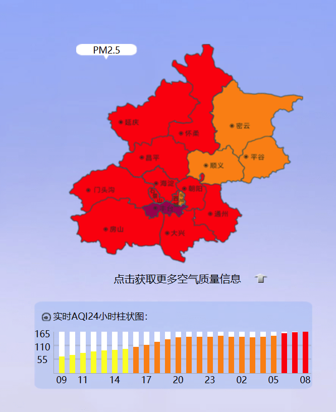 据北京空气质量监测网站实时消息,10月29日8时,北京实时空气质量指数165,达到中度污染,首要污染物PM2.5。其中,丰台区为重度污染。