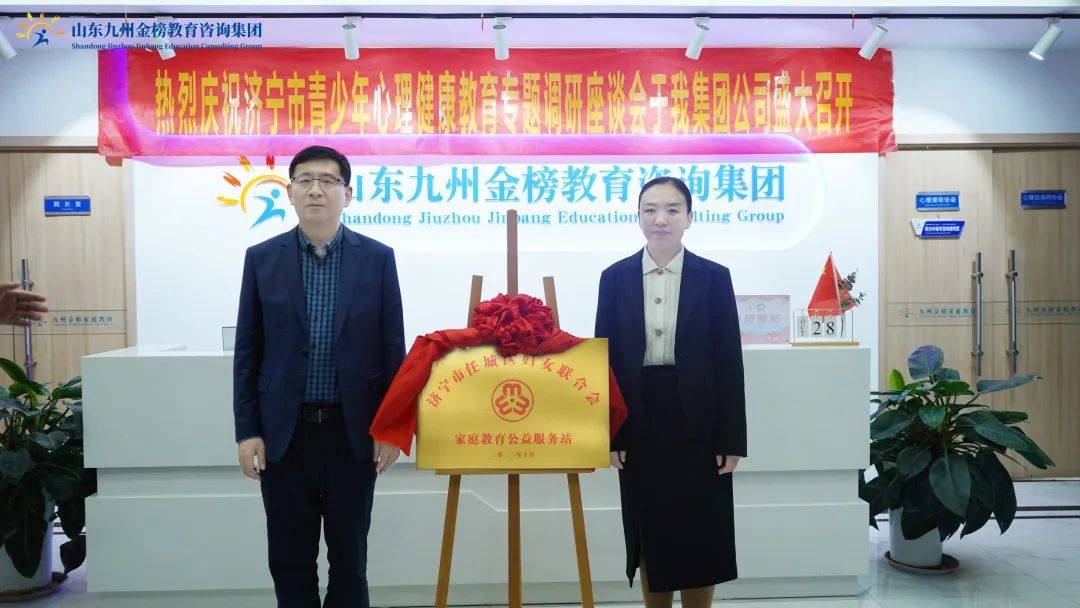 2023年10月28日,家庭教育公益服务站正式落户山东九州金榜教育咨询集团!山东省家庭文化研究会副会长、省家庭教育文化中心原主任孙伟与任城区妇联主席文静共同为家庭教育公益服务站揭牌。集团公司董事长冯海宁、总裁杨欢、总经理高艳生等领导陪同接待。
