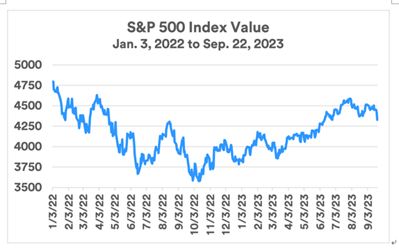 第三,加息对债券市场的影响。自2022年初以来,整个债券市场的利率环境发生了巨大变化,收益率全面上升。更不寻常的是,短期国债的收益率高于10年期和30年期债券的收益率。2023年9月下旬,3个月期国债收益率为5.56%,2年期国债收益率为5.12%,而10年期国债收益率为4.35%。高盛的经济学家7月份表示,投资者不应担心收益率曲线倒挂,这一次并不预示着经济衰退,因为期限溢价远低于长期平均水平。10月18日,10年期国债收益率升至4.902%,为2007年7月以来的最高收盘水平。标普500指数下跌1.3%。道琼斯指数下跌332.57点,跌幅为1%。纳斯达克综合指数下跌1.6%。