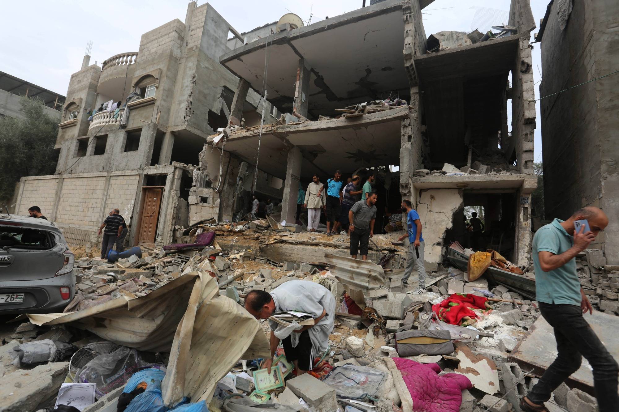 10月29日,在加沙地带南部城市拉法,人们查看被以军空袭损毁的建筑。新华社发(哈立德·奥马尔摄)