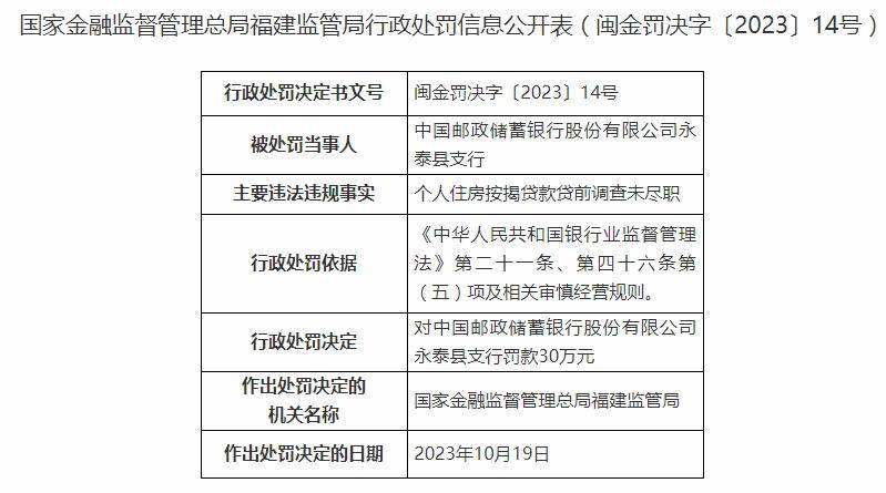 具体而言,因个人住房按揭贷款贷前调查未尽职,建设银行福建省分行被罚20万元;邮储银行永泰县支行被罚30万元;工商银行永泰支行被罚30万元;农业银行永泰县支行则被罚35万元。