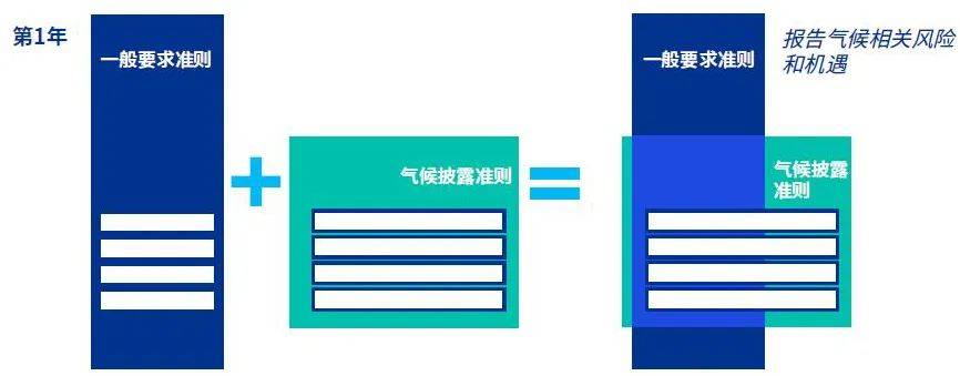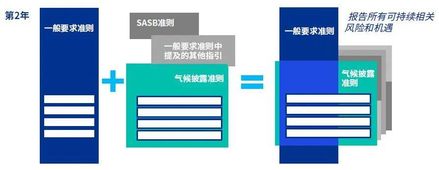 在第二年,企业需要应用一般要求准则和该准则中提及的其他指引(如SASB发布的准则和气候披露准则),报告所有可持续相关风险和机遇。