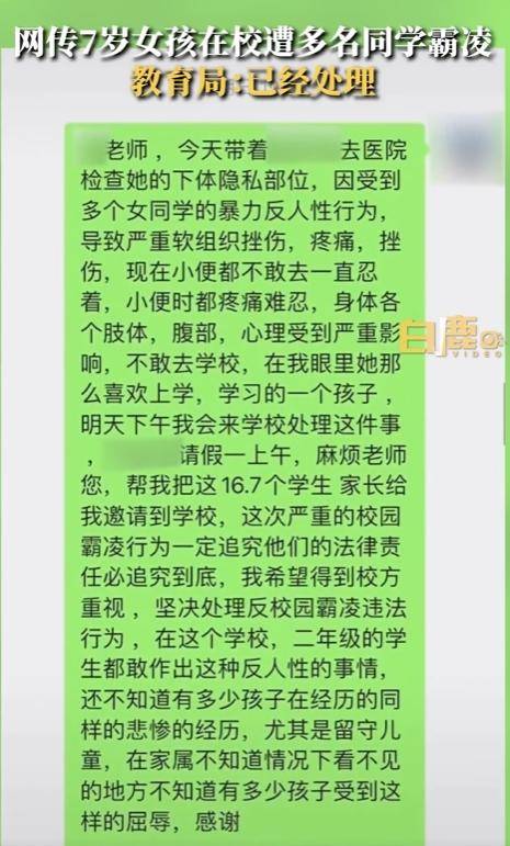 近日,湖南娄底冷水江一家长在网上发视频反映,其7岁的女儿在渣渡中心小学上二年级,10月20日在学校遭到同班多名同学霸凌,包括性霸凌,导致孩子下腹和下体疼痛。10月30日上午,北京青年报从冷水江市网信办工作人员处获悉,针对家长反映的情况,10月29日,当地已由教育局牵头成立了工作专班,正在对此事进行调查处理。