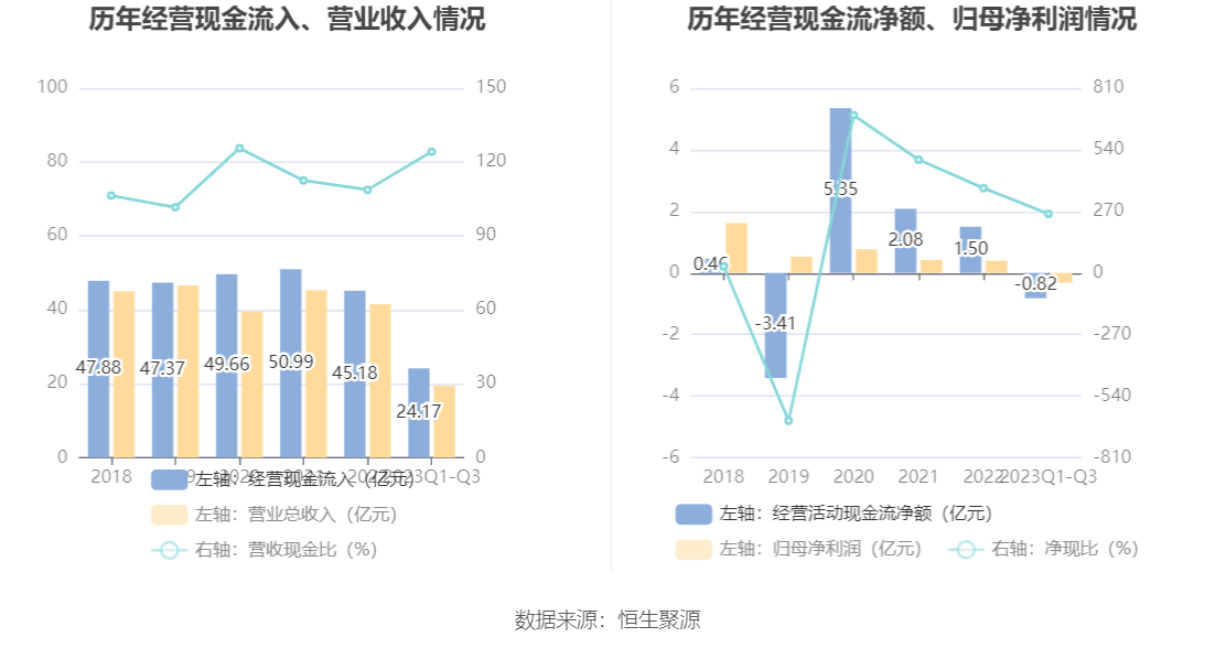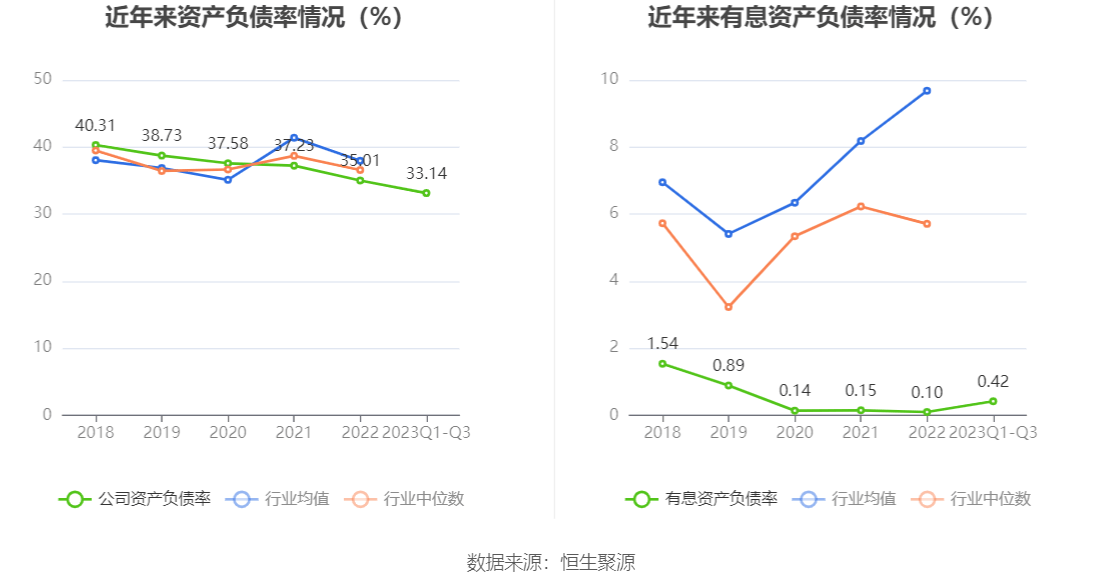在偿债能力方面,公司2023年三季度末资产负债率为33.14%,相比上年末下降1.87个百分点;有息资产负债率为0.42%,相比上年末上升0.32个百分点。