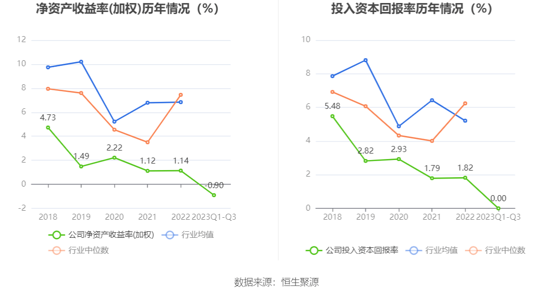 数据显示,2023年前三季度公司加权平均净资产收益率为-0.90%,较上年同期下降1.02个百分点;公司2023年前三季度投入资本回报率为0.00%,较上年同期下降0.55个百分点。