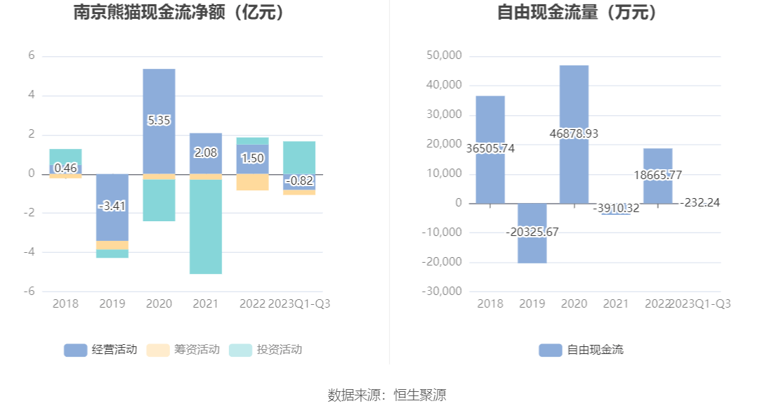 2023年前三季度,公司经营活动现金流净额为-8228.92万元,同比减少1.28亿元,主要系本期销售商品、提供劳务收到的现金减少所致;筹资活动现金流净额-2451.86万元,同比增加4748.84万元,主要系本期支付少数股东分红较上期减少所致;投资活动现金流净额1.66亿元,上年同期为8553.56万元,主要系本期购买理财产品的金额减少所致。