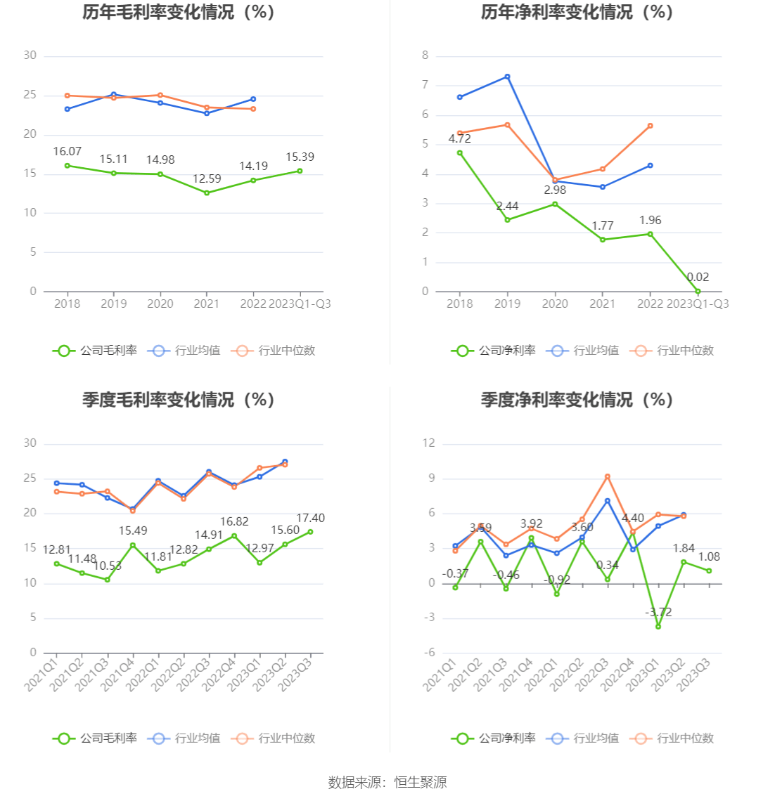 2023年前三季度,公司毛利率为15.39%,同比上升2.28个百分点;净利率为0.02%,较上年同期下降0.94个百分点。从单季度指标来看,2023年第三季度公司毛利率为17.40%,同比上升2.49个百分点,环比上升1.80个百分点;净利率为1.08%,较上年同期上升0.74个百分点,较上一季度下降0.76个百分点。