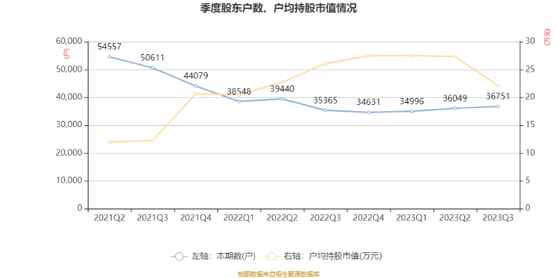 筹码集中度方面,截至2023年三季度末,公司股东总户数为3.68万户,较二季度末增长了702户,增幅1.95%;户均持股市值由二季度末的27.35万元下降至22.08万元,降幅为19.27%。