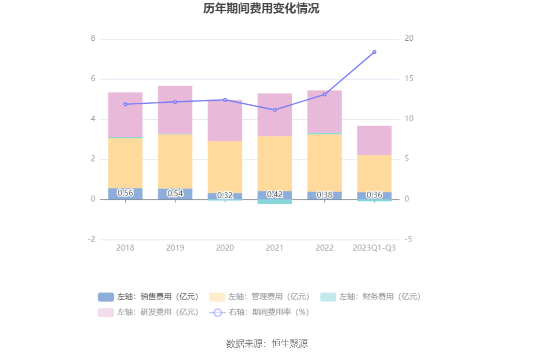 2023年前三季度,公司期间费用为3.57亿元,较上年同期减少2577.95万元;但期间费用率为18.36%,较上年同期上升5.37个百分点。其中,销售费用同比增长10.87%,管理费用同比增长5.6%,研发费用同比下降13.16%,财务费用由去年同期的736.95万元变为-955.10万元。