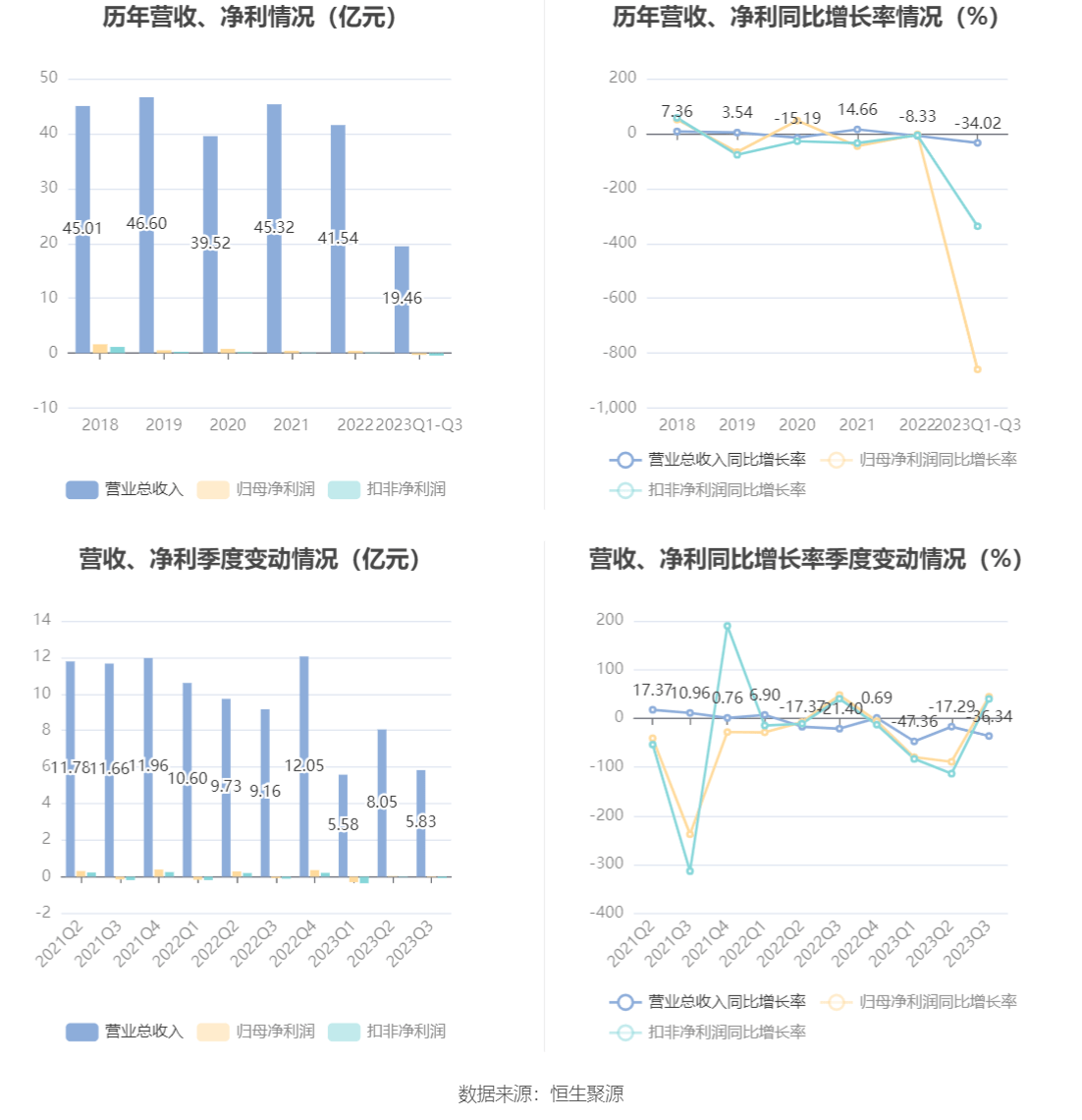 根据三季报,公司第三季度实现营业总收入5.83亿元,同比下降36.34%,环比下降27.50%;归母净利润-437.46万元,同比增长44.09%,环比下降240.65%;扣非净利润-679.13万元,同比增长39.73%,环比下降143.59%。