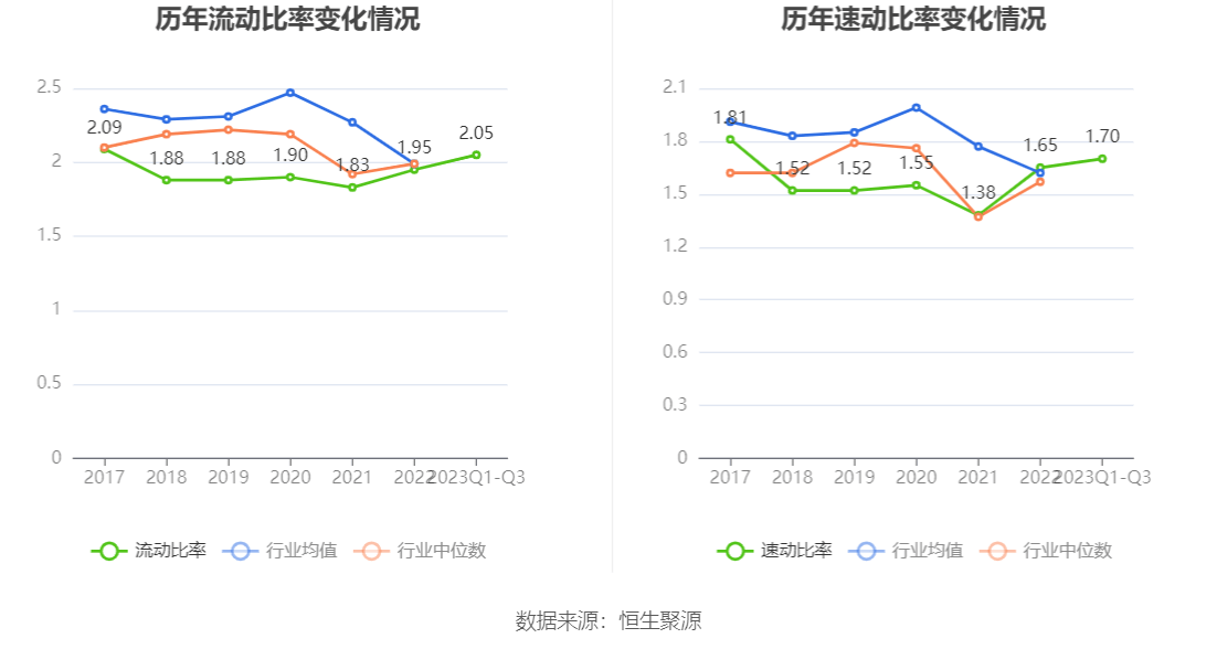 2023年前三季度,公司流动比率为2.05,速动比率为1.70。