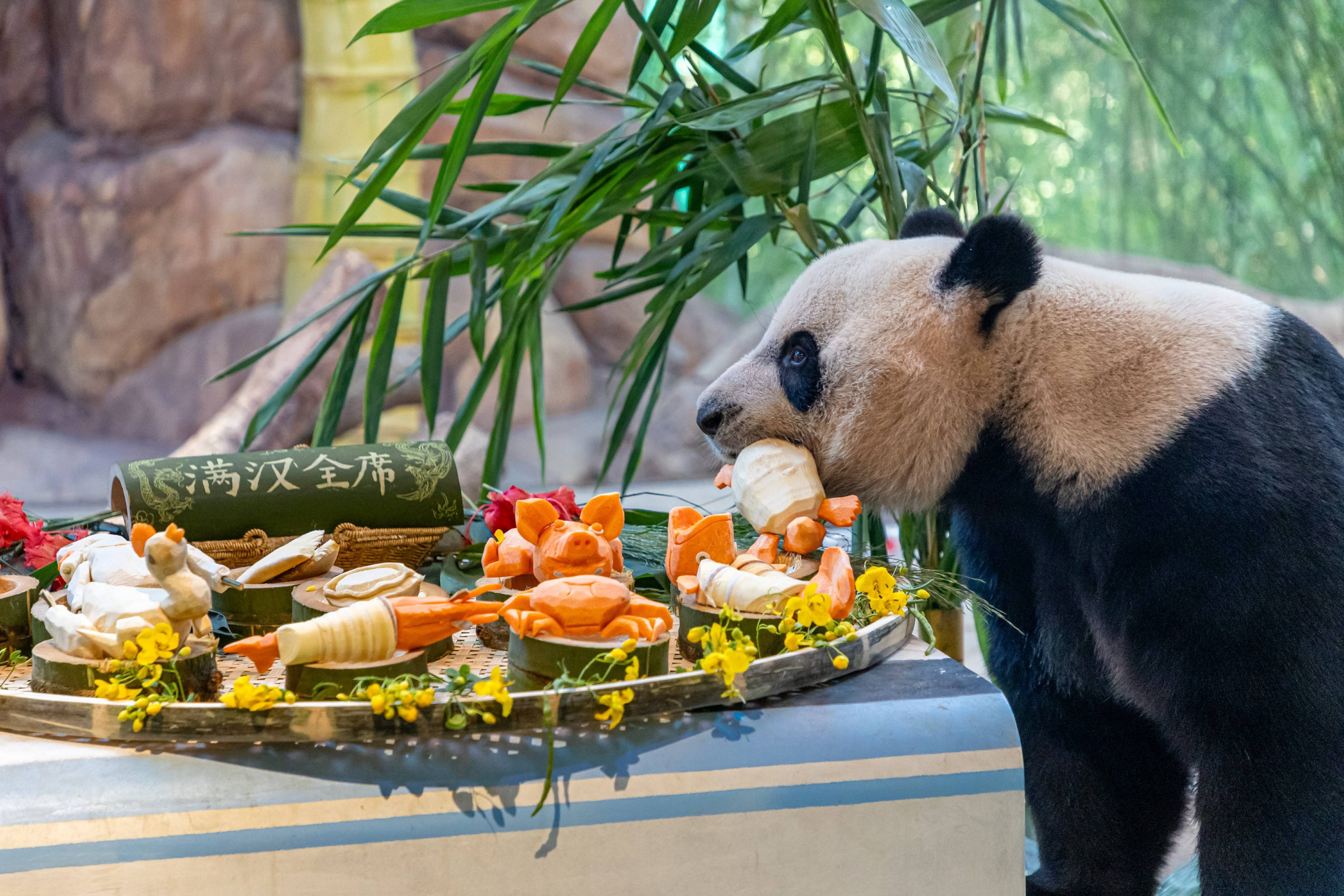 随着游客们的欢呼声,大熊猫酷酷“小步”来到“下午茶”面前,拿起雕刻成“鸡丝汤”的红萝卜和竹笋,搭配旁边的七彩水果大餐,大口开吃。10月27日是国际熊猫日,生活在广州长隆野生动物世界里的“老广”大熊猫们,美美地享受了一顿“下午茶”。