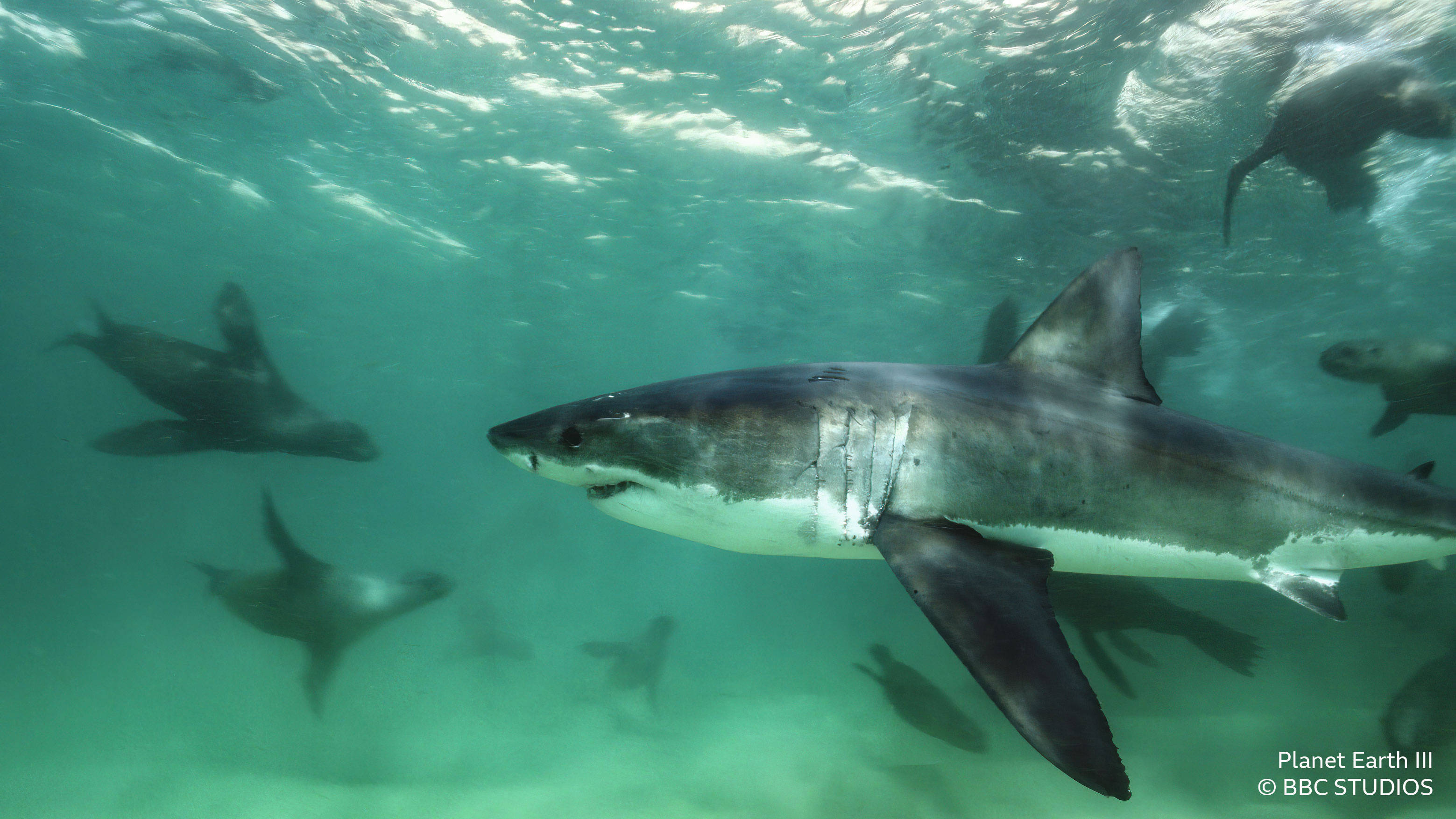 此外,第一集的亮点还包括拥有“冰海天使”之称的裸海蝶,这种善于欺骗的动物拥有非常邪恶的一面——作为贪婪的捕食者,它们的伏击行动和科幻恐怖片里的情节如出一辙。摄制组还在南非海岸成功捕捉到了大白鲨和南非海狗互动的最完整画面,而这种行为至今还没有科学能够解释。