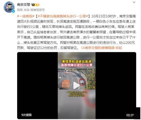 10月23日10时许,南京交警高速四大队视频巡查时发现,长深高速龙袍互通路段,一辆白色小车在应急车道上逆向行驶约1公里,随后又原地掉头返回。民警在龙袍收费站将其拦停。驾驶人杨某表示,自己从盐城老家出发,带外婆去南京溧水的舅舅家探望,在看导航过程中误开下高速。随后杨某掉头逆行驶回高速公路,逆行一公里后才反应过来自己干了什么,掉头恢复正常驾驶方向。民警对杨某在高速公路逆行的违法行为,处以200元罚款、驾驶证记12分的处罚,扣留驾驶证。