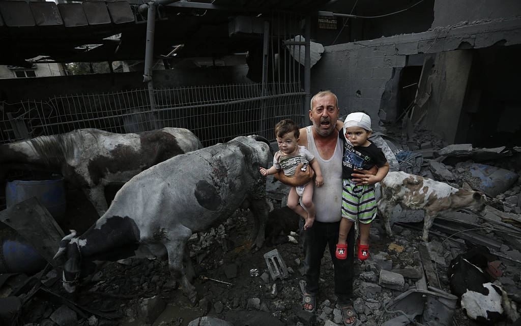 当地时间2023年10月29日,以色列空袭加沙后,男子抱着孩子,赶着牛,冲出受损建筑。