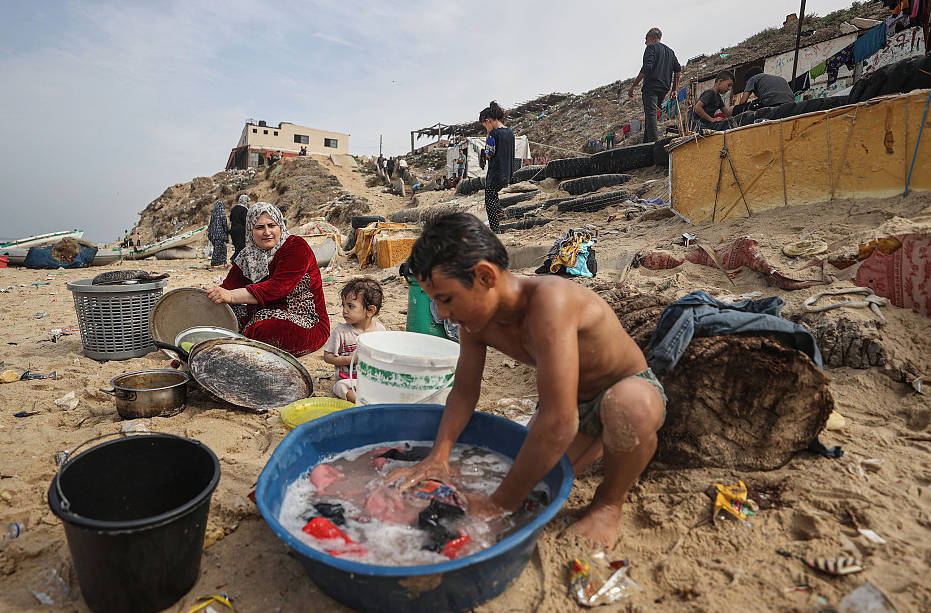 当地时间2023年10月29日,加沙地带被停水期间,人们使用海水洗衣服。